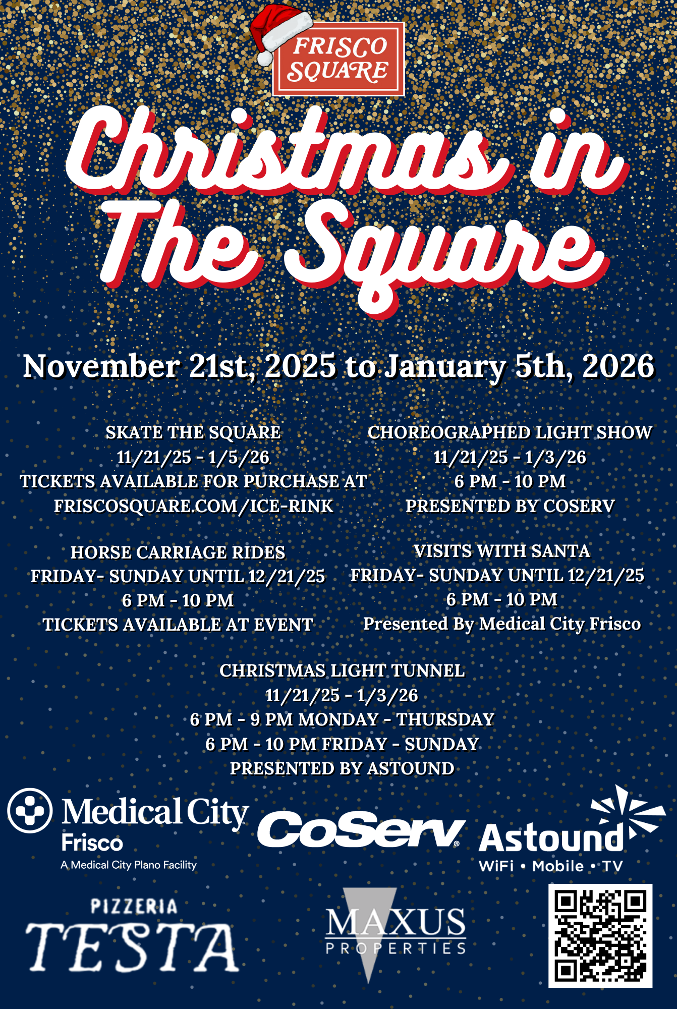 In partnership with the City of Frisco, the Frisco Square Property Owners Association presents the largest choreographed holiday lights and music show in North Texas. Christmas in the Square returns for its historic 20th anniversary with even more fun surprises this year! It’s beginning to look a lot like Christmas at Frisco Square!